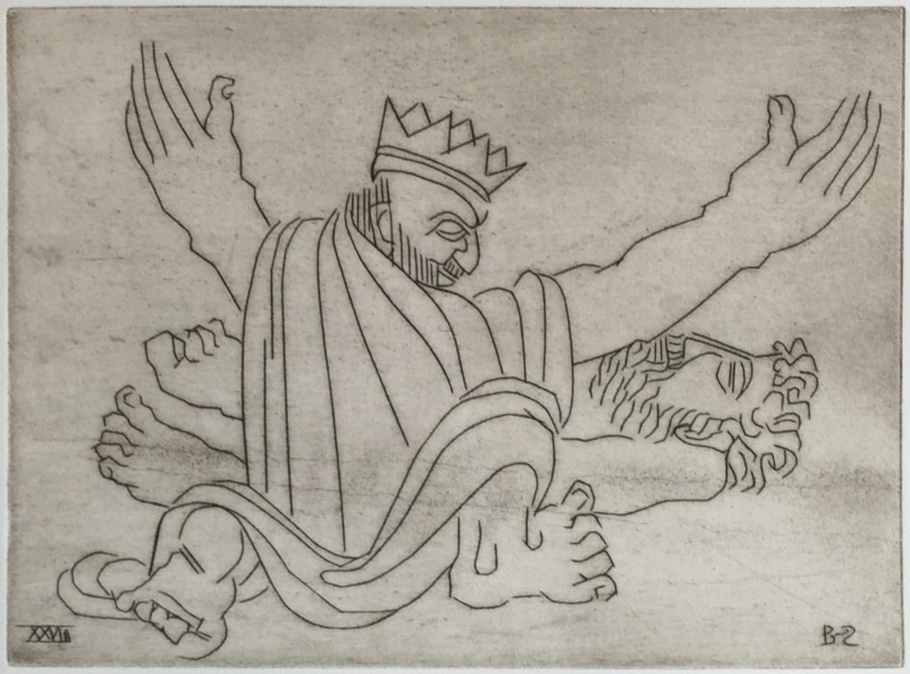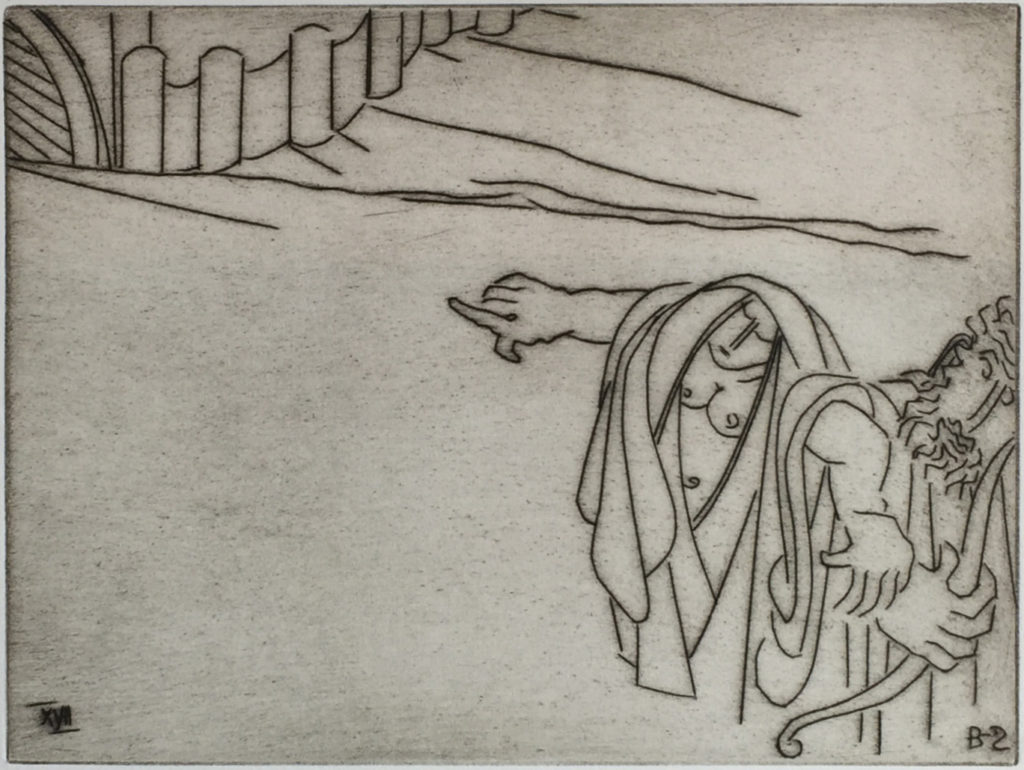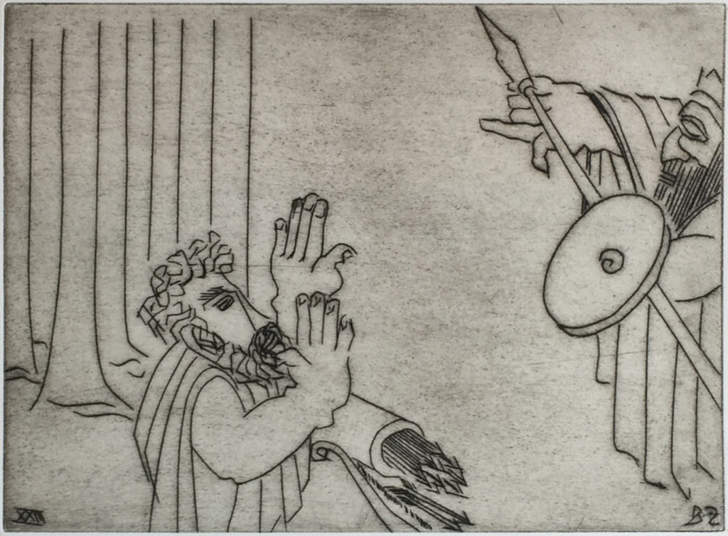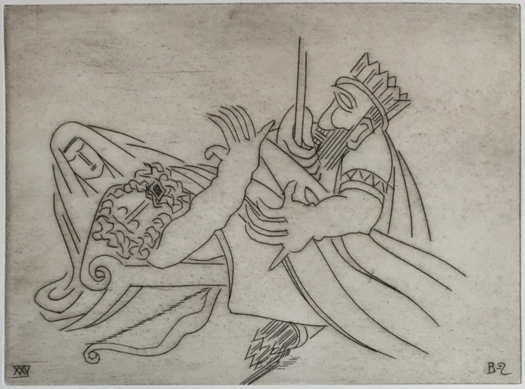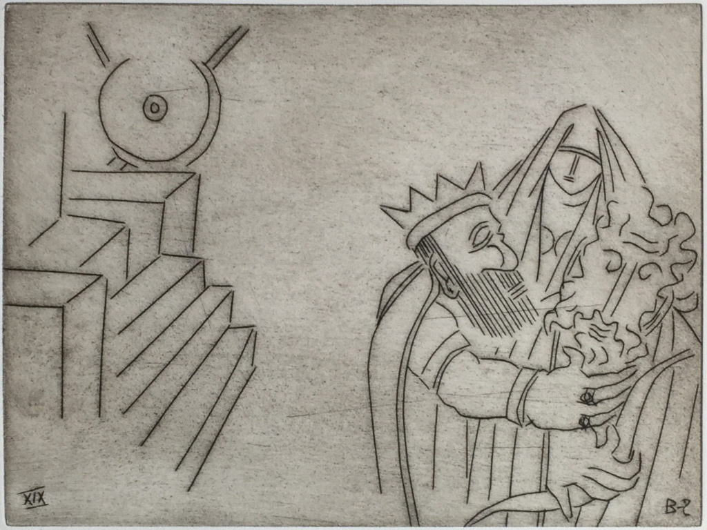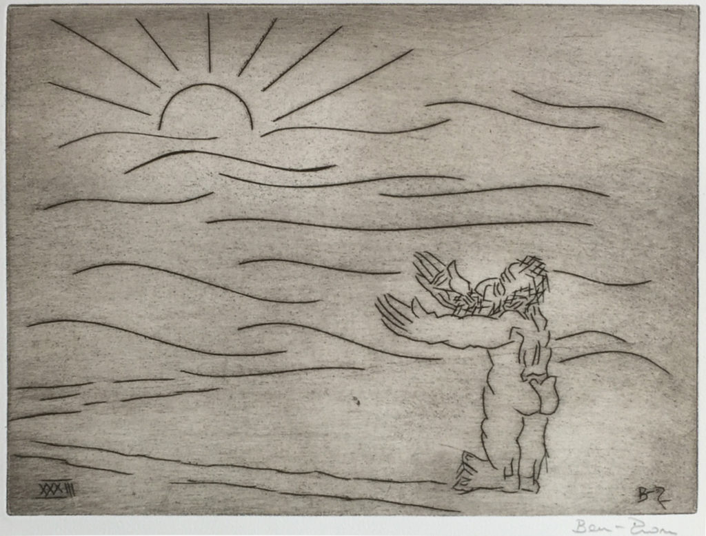 While many of Ben Zion's works were eclipsed at one time by more modern forms of expression, time has shown that his fidelity to form, line and color created enduring and important collections of his works. Among these are his etchings, many of which can be seen at the Metropolitan Museum in New York City. POBA has been given access to a rare set of his signed limited edition plates of some of his most important etchings, here depicting moments and persons in the Old Testament. As etchings, the lines are clear, round and thick, in contrast to the lush and textured lines found in many of his paintings and sketches and the whimsical forms found in many of his sculptures.