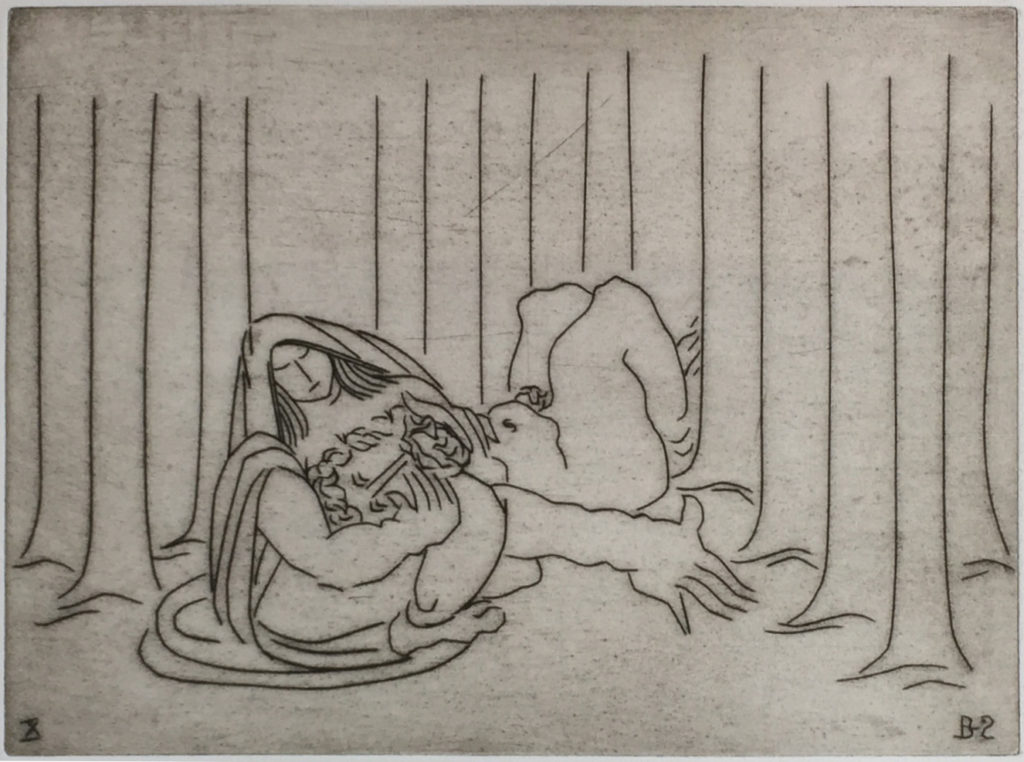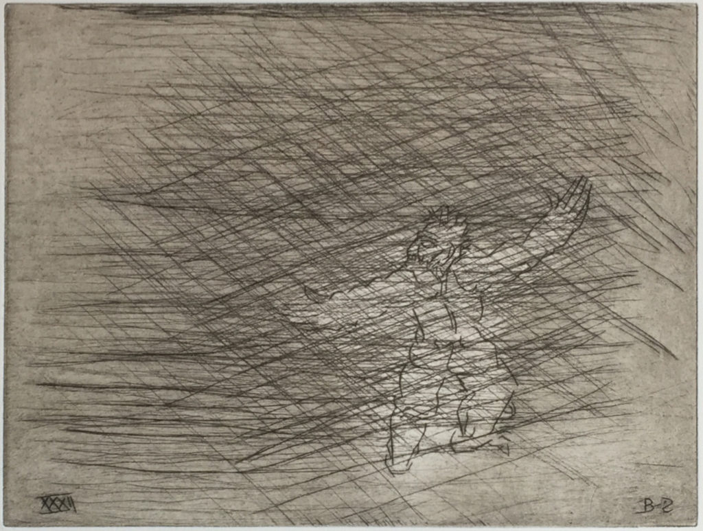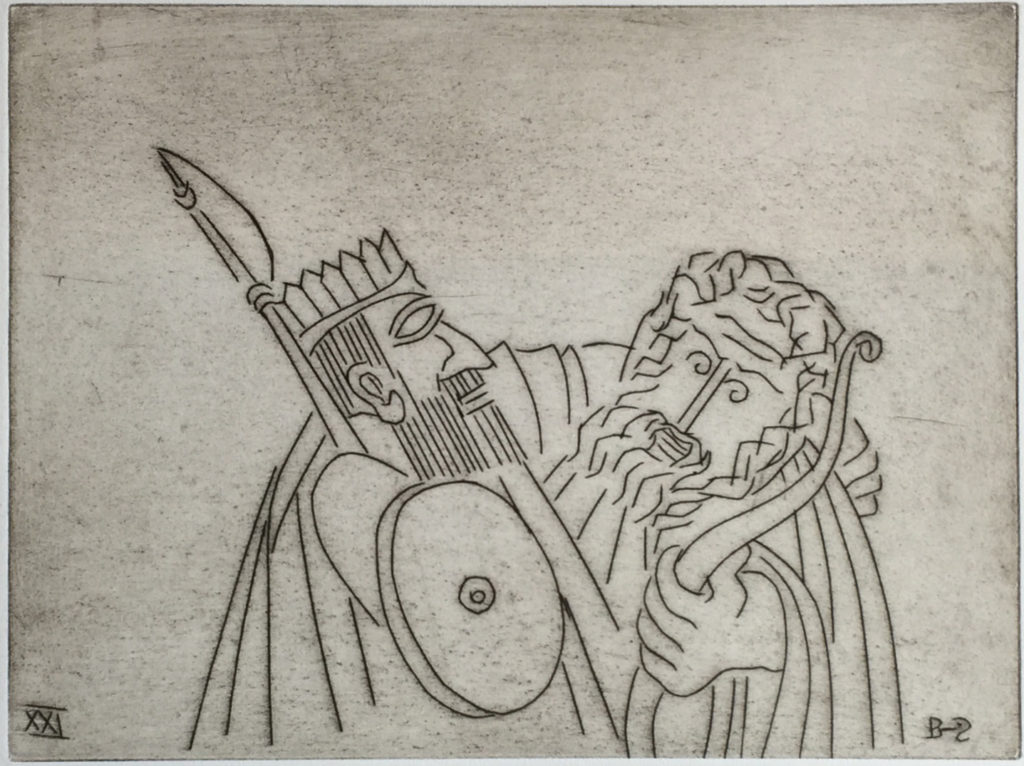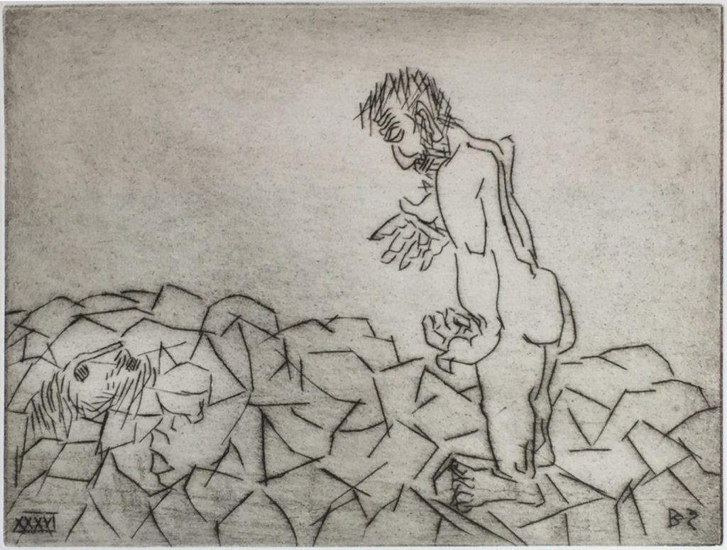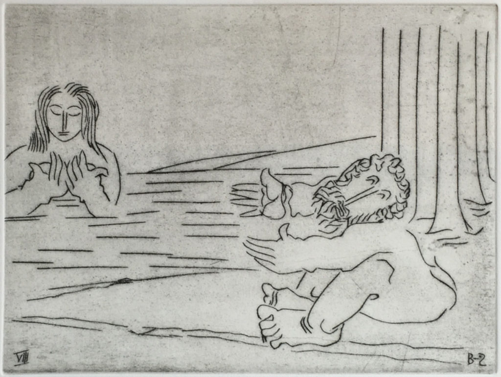 While many of Ben Zion's works were eclipsed at one time by more modern forms of expression, time has shown that his fidelity to form, line and color created enduring and important collections of his works. Among these are his etchings, many of which can be seen at the Metropolitan Museum in New York City. POBA has been given access to a rare set of his signed limited edition plates of some of his most important etchings, here depicting moments and persons in the Old Testament. As etchings, the lines are clear, round and thick, in contrast to the lush and textured lines found in many of his paintings and sketches and the whimsical forms found in many of his sculptures.