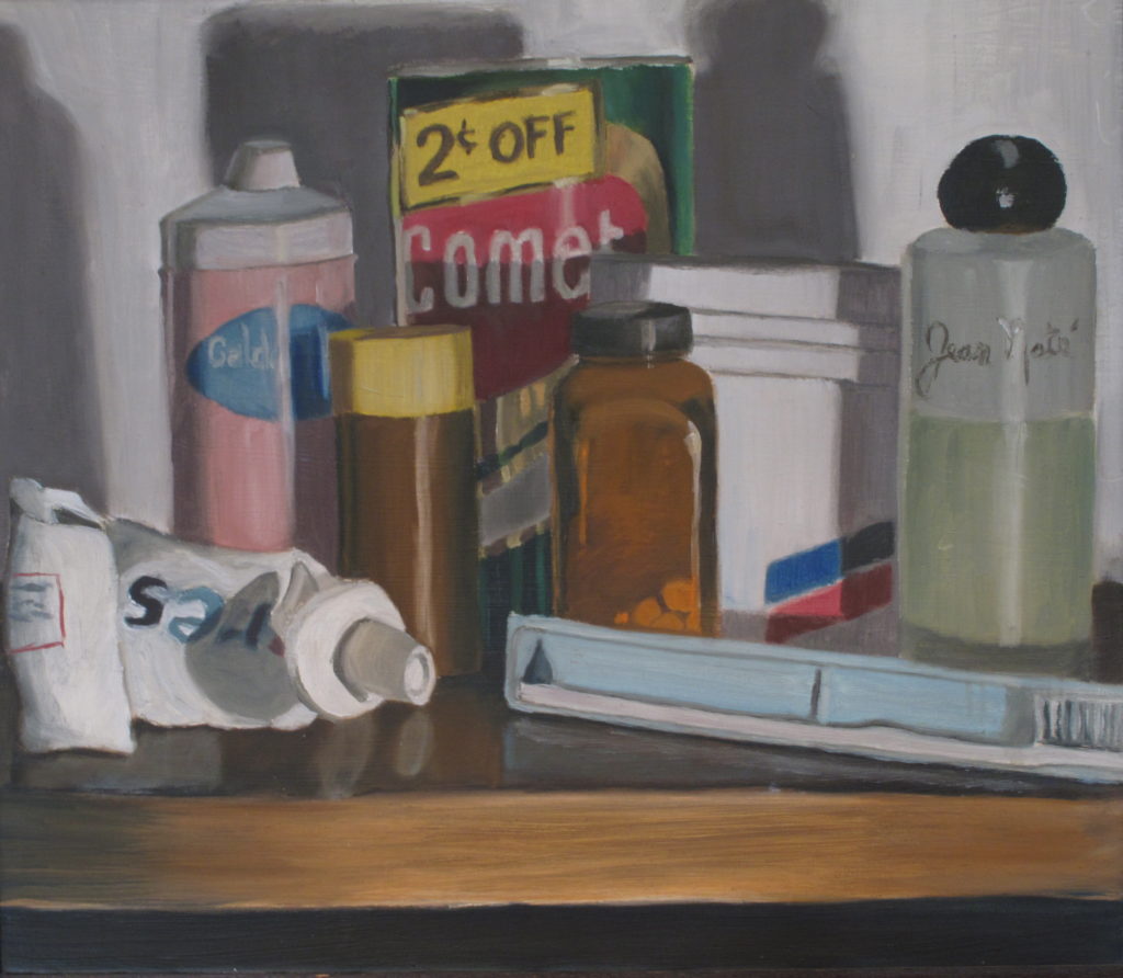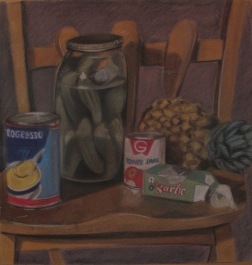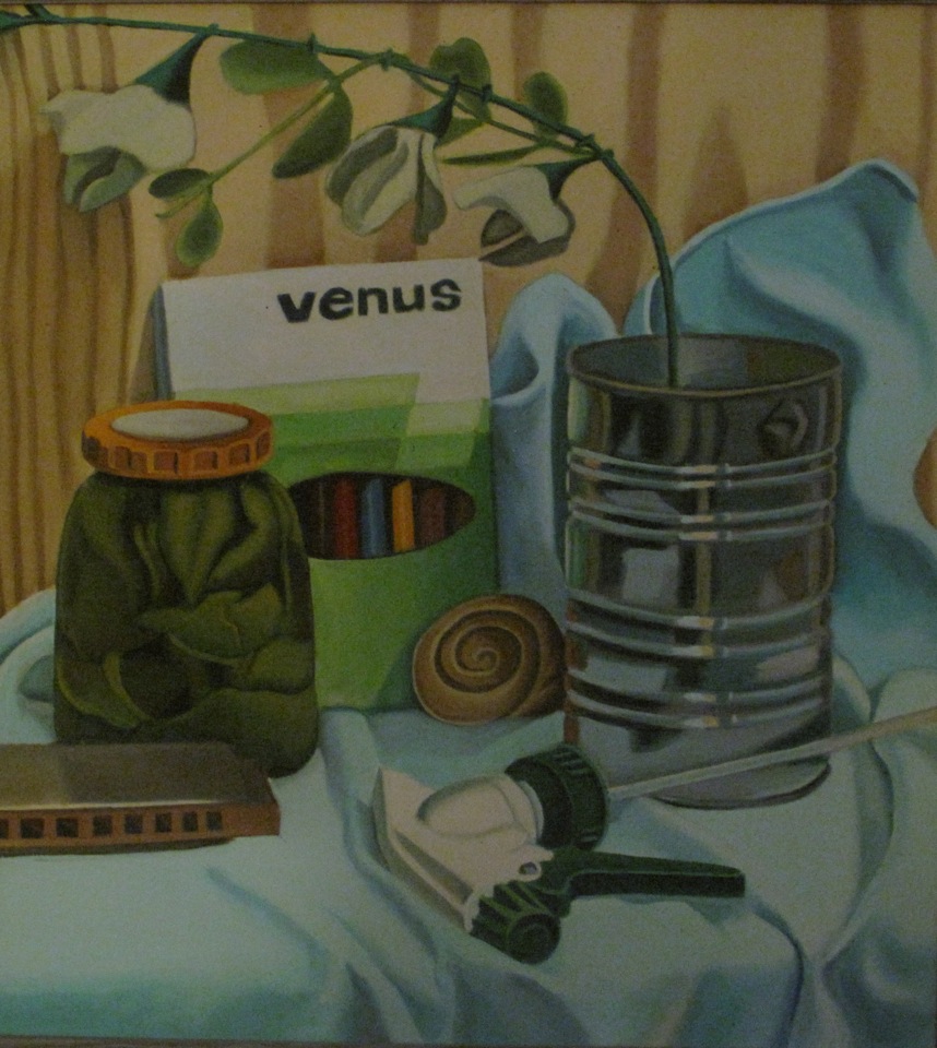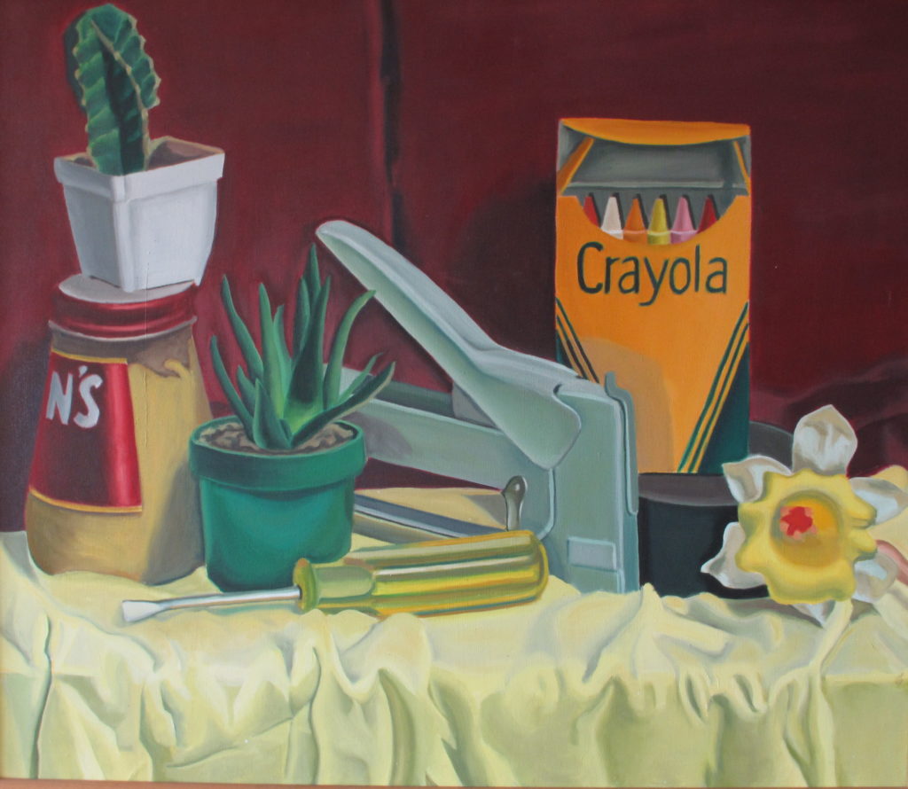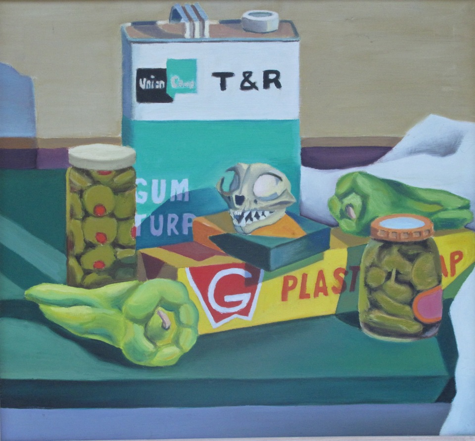 Daniel Mincer (1953-1981) was a versatile artist who had a strong interest in composition. His still life paintings, created both in oils and in pastels, combine everyday and commercial objects in a way that shows their relationships in daily life and their juxtaposition in form, color, and orientation. They often exhibit his offbeat and wry sense of humor. In the last three works here, household objects are larger than life and appear almost animate.