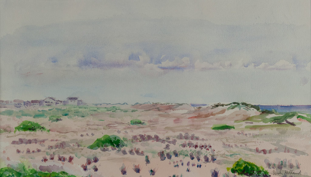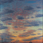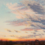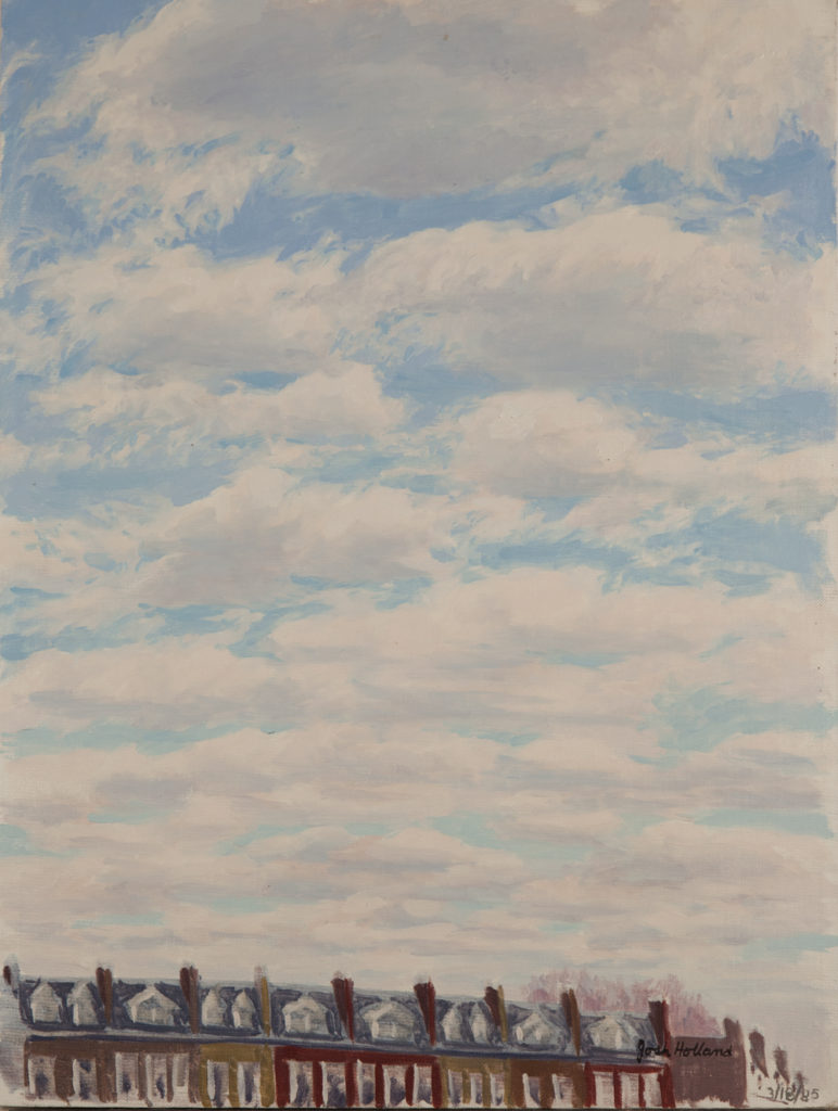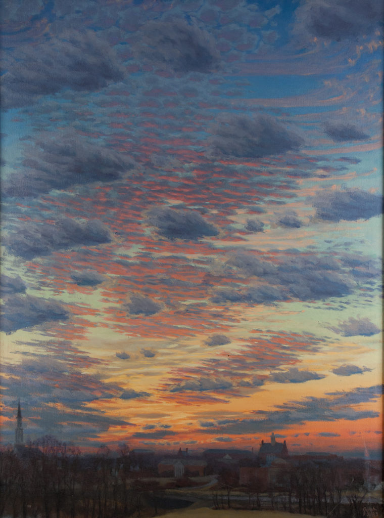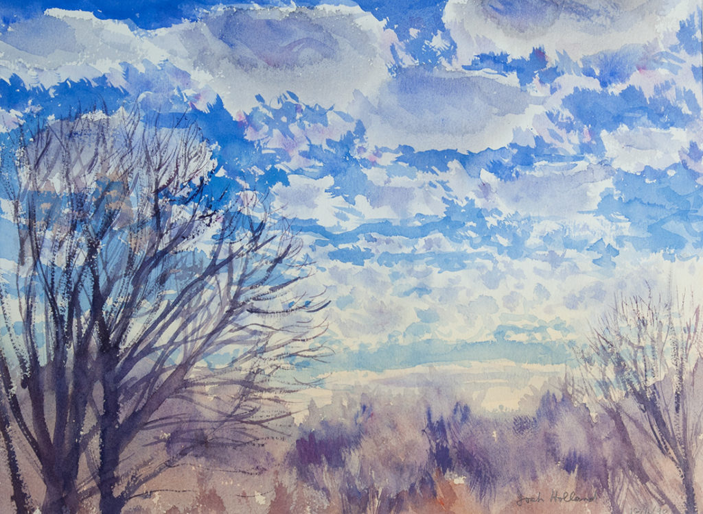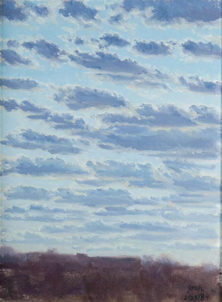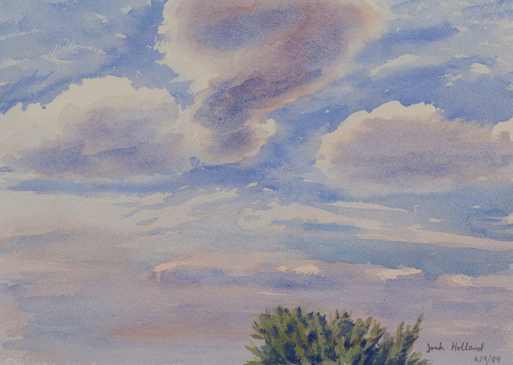 For Josh Holland science and art were like the double strands of his creative DNA. His first degree in science was bestowed by the University of Chicago in 1941 at the age of 18, but he had been attending classes at the Art Institute of Chicago since 1937, from the age of 14. His resume quietly stated his service as a "weather officer" from 1942-1946, for which he earned an Air Force Commendation Medal in 1945. But he never forgot his studies before and after WWII as an "art student." While there are sketchbooks with soft pencil skyscapes and beach watercolors of ocean and sky, his painting of sky as the subject of his descriptive art was poignantly focused in January 1983 with a series of 4 large scale sunsets as his first marriage of 36 years came to an end. This period marked the re-emergence of Josh Holland, the artist, from a 33-year career in meteorology.