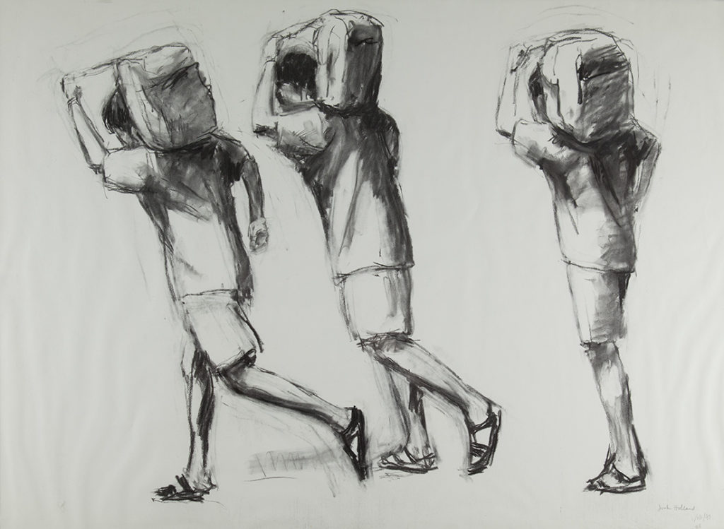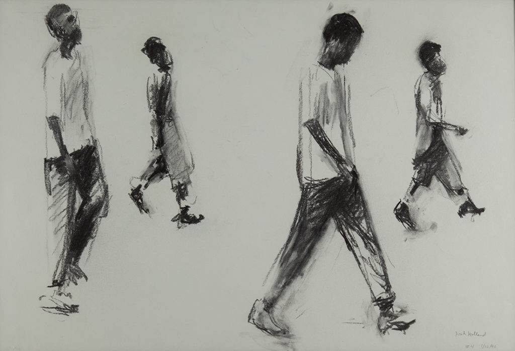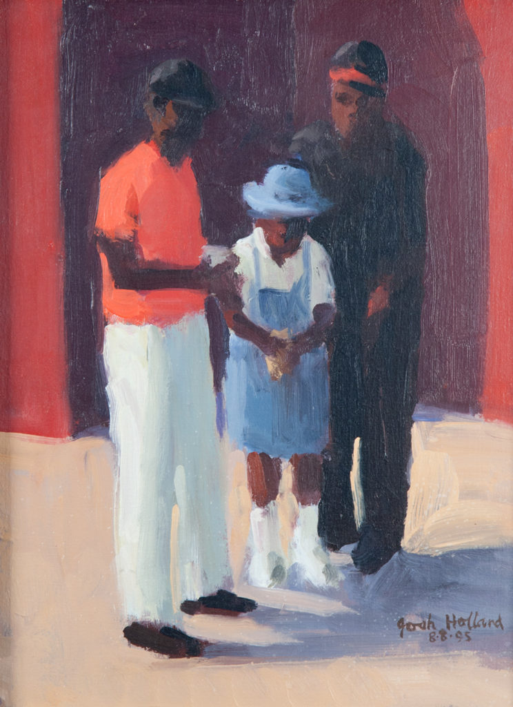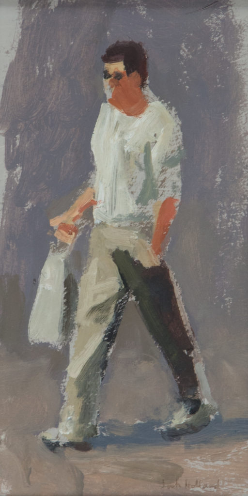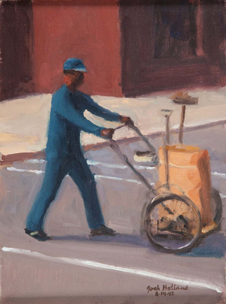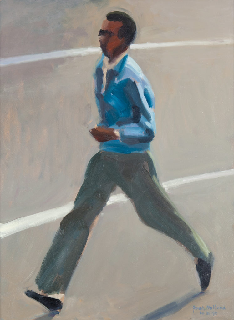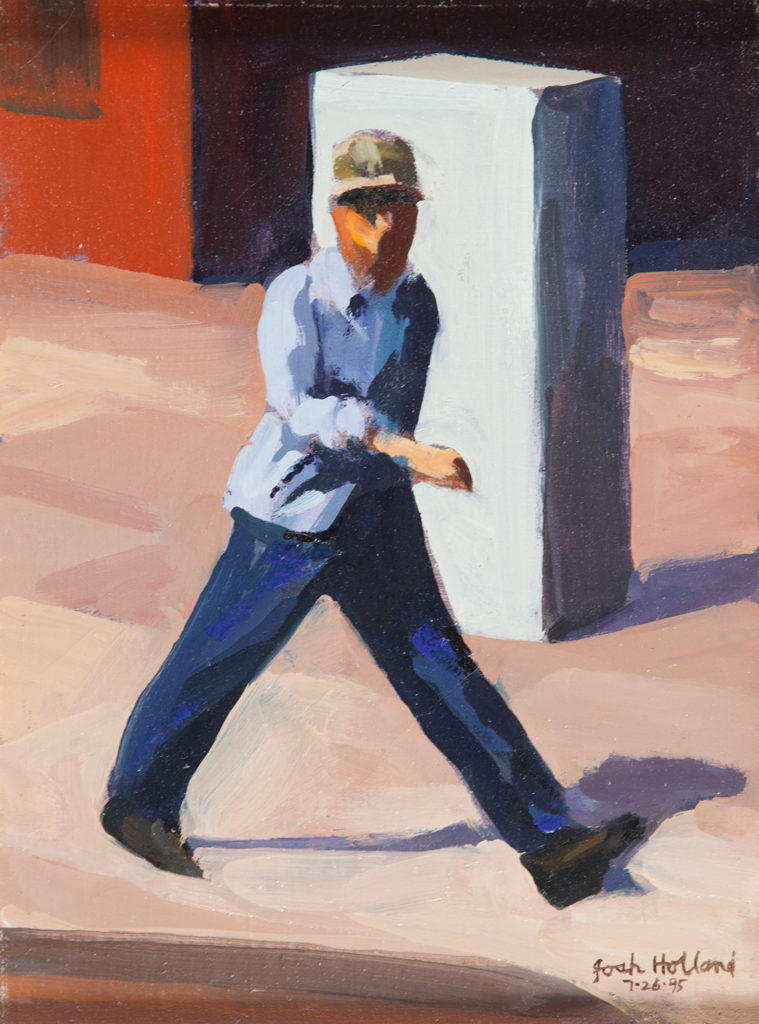 Between the years of 1994-1996, Josh Holland created over a hundred works in his series of "Pedestrians." Fascinated with the ebb and flow of people outside of his 2nd floor studio space on 14th Street, NW in Washington, DC, he observed the interactions and spatial relationships between and among people at the busy intersection below. There was a school for the blind nearby, and watching blind pedestrians offered another view of how people adapt, and relate to one another. Josh was moved and entranced by the forms waiting at the bus stop across the street, evidence of the life expressed in the body, and relationships described in the spaces between. He took hundreds of photographs that enabled him to study and create compositions as fresh as the moment a person stepped off the curb. Most of the pieces were quite small, even as small as 3.5"x4" in oil on linen. There were a few enormous studies, however, attempting to show the entire urban scene. These are held in a private collection. Should permission be granted, images will appear here. In 1995-6-7 these works were shown at The Touchstone Gallery, displayed in layers up the walls. Many are held in private collections.