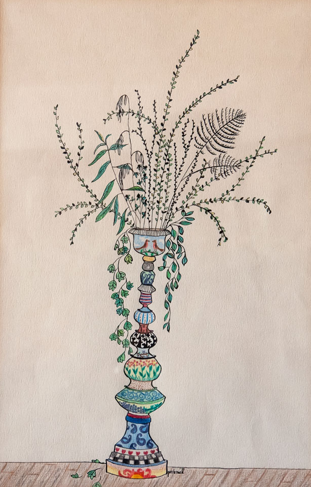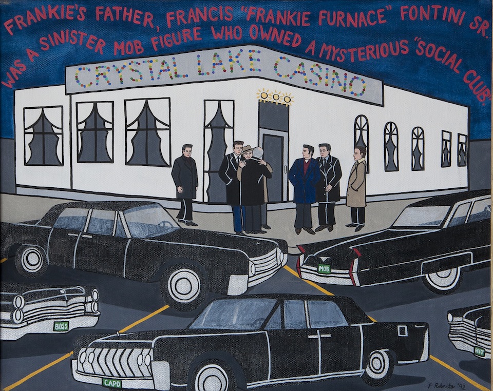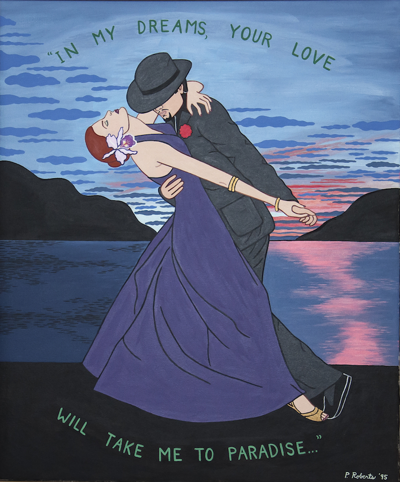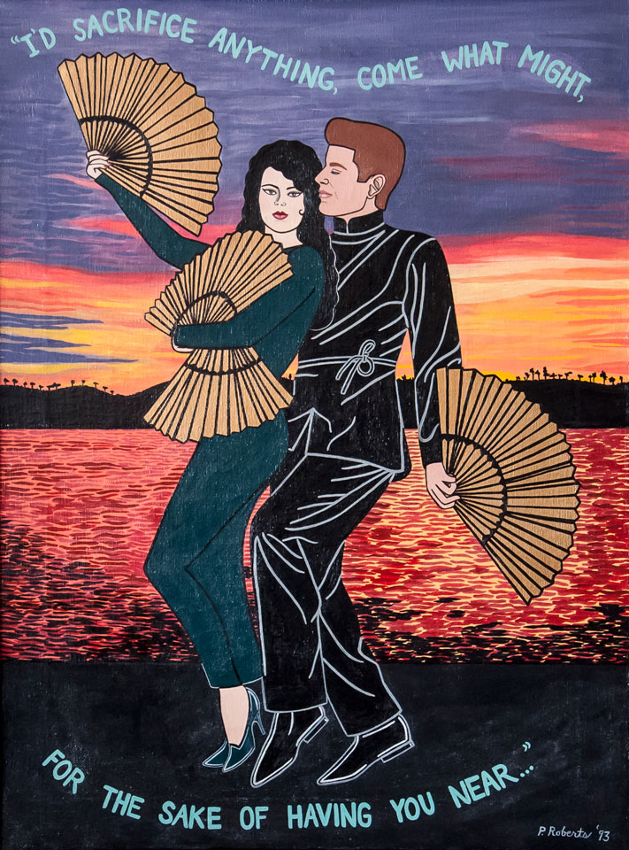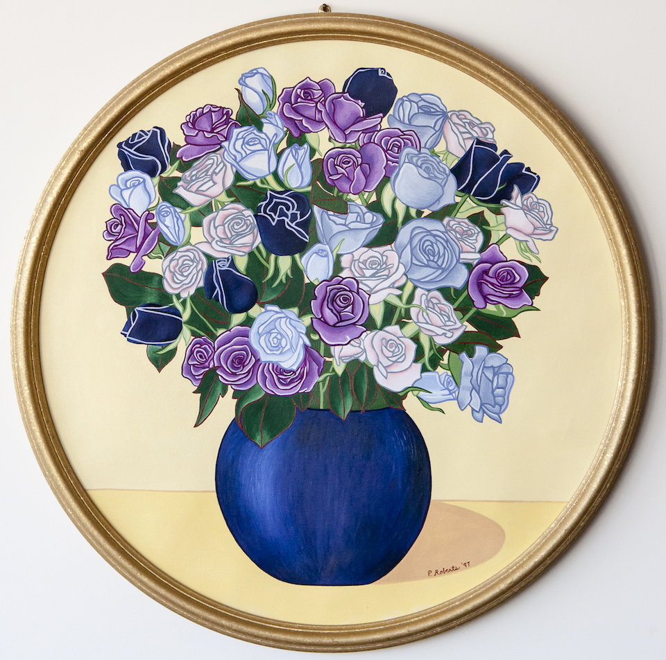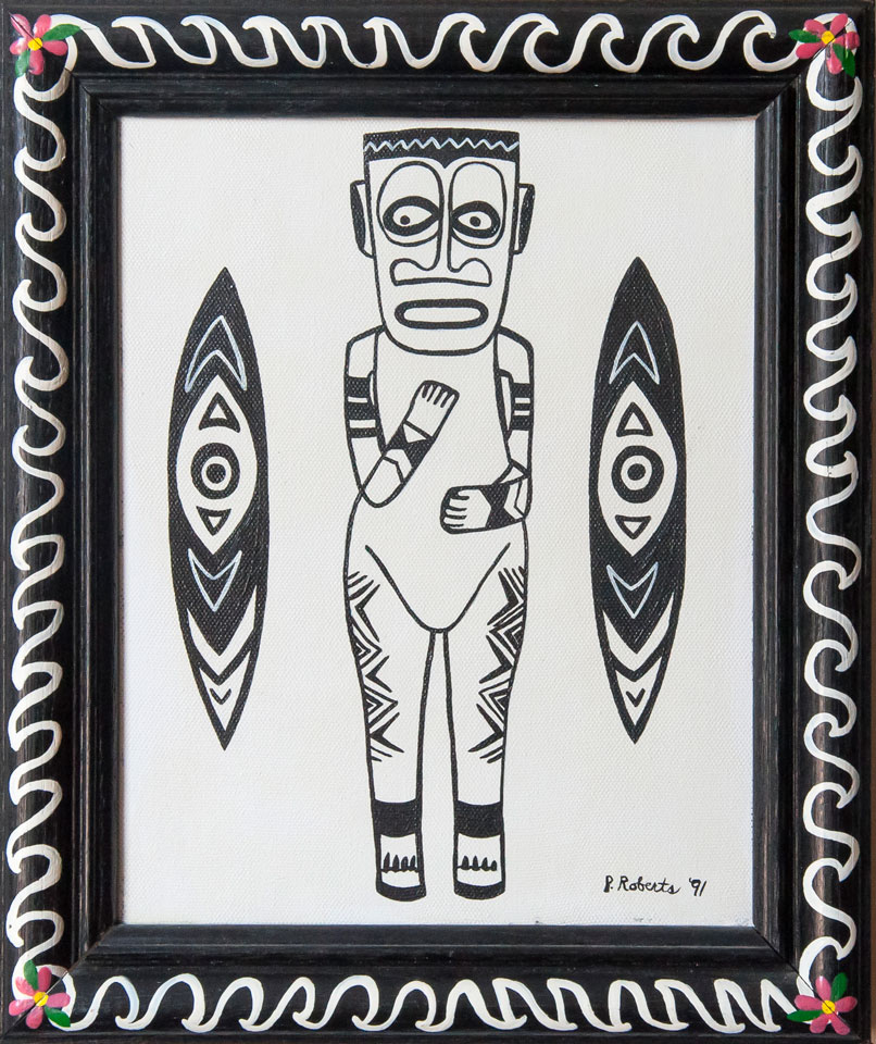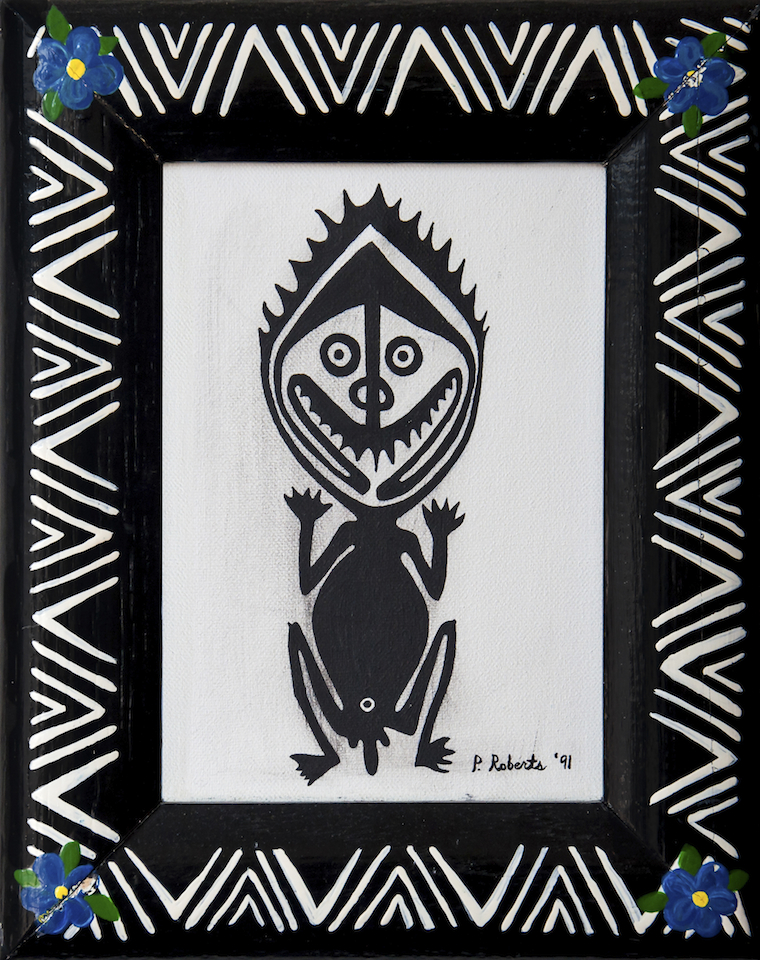 Pamela (Brown) Roberts (1953-1998) became interested in art as a teen-ager, graduating from the highly selective New York City High School of Visual Arts. As she would ruefully later say, she learned a lot about art concepts from her formal studies but not nearly enough about how to draw. After a time in the Punk music scene and a related interest in tattoo arts, she began to experiment with painting and drawing, motivated by her self-teaching, her twin sister's early death, and her own desire to live her life to the fullest. Her unique style comes from these disparate threads.